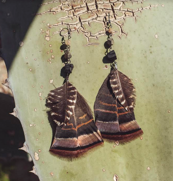 Real turkey feathers with pyrite, black tourmaline, and sunstone on gunmetal chain.