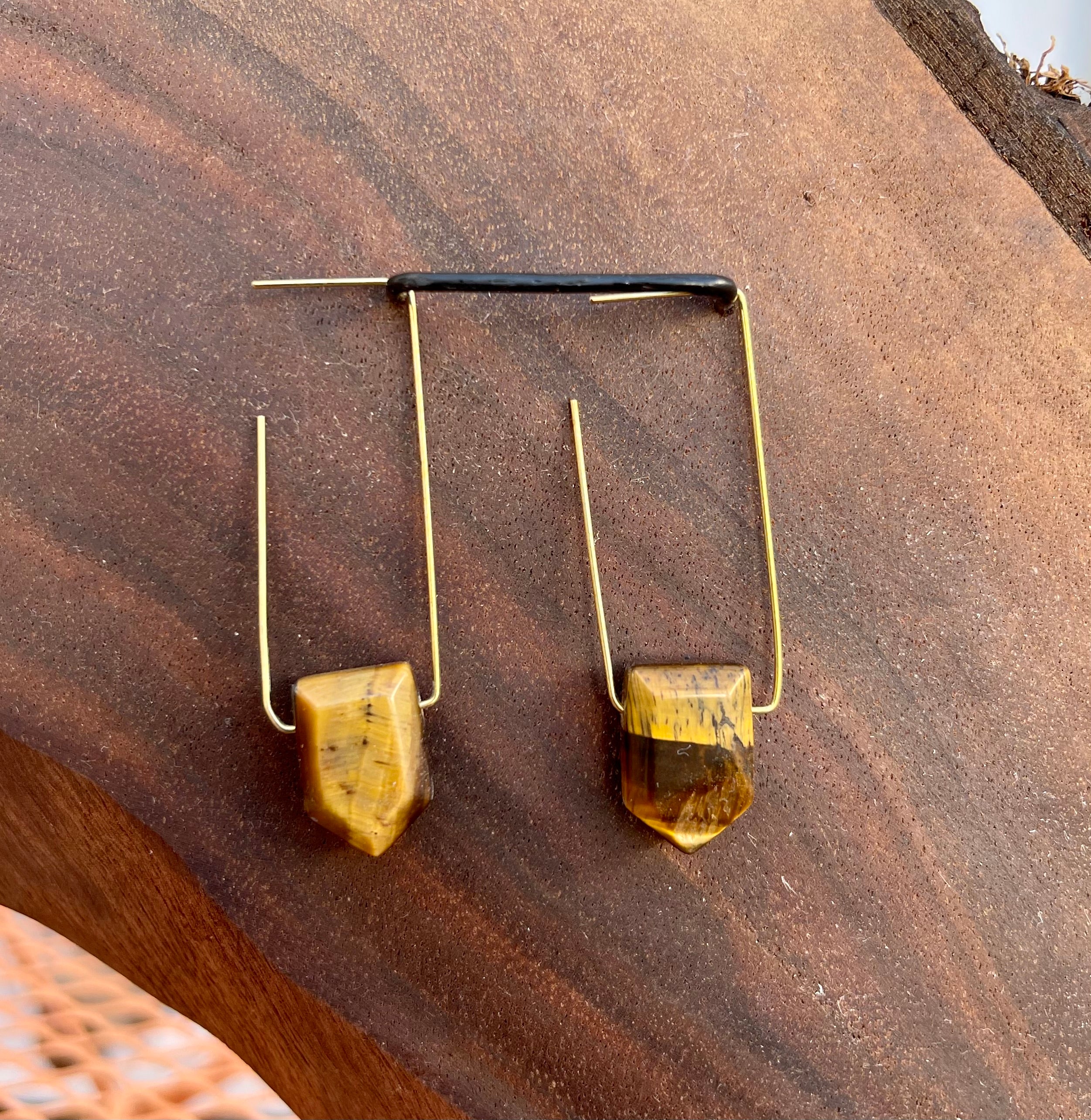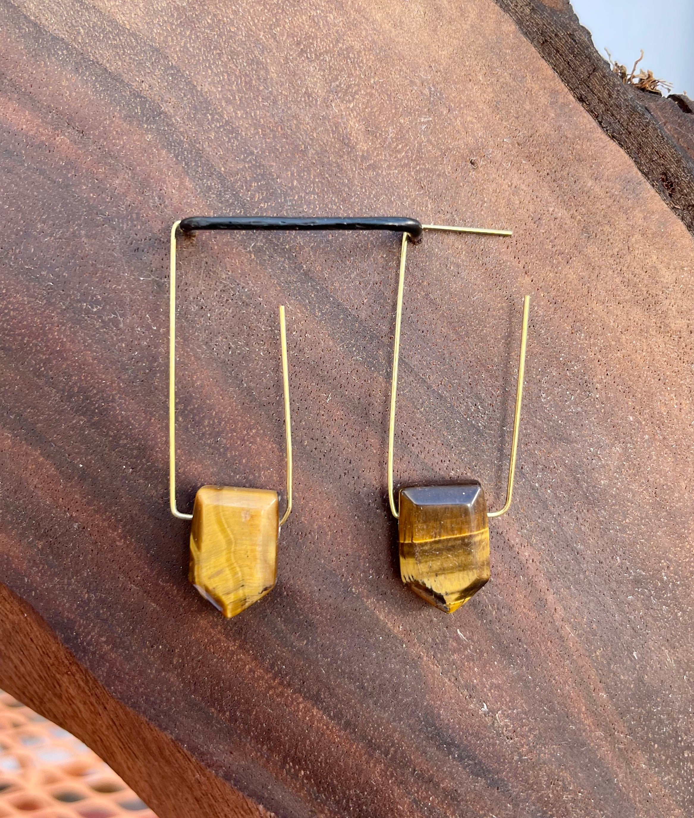 Tigers Eye hang from lightweight brass rectangular hoops. These minimal statement earrings are light weight and versatile