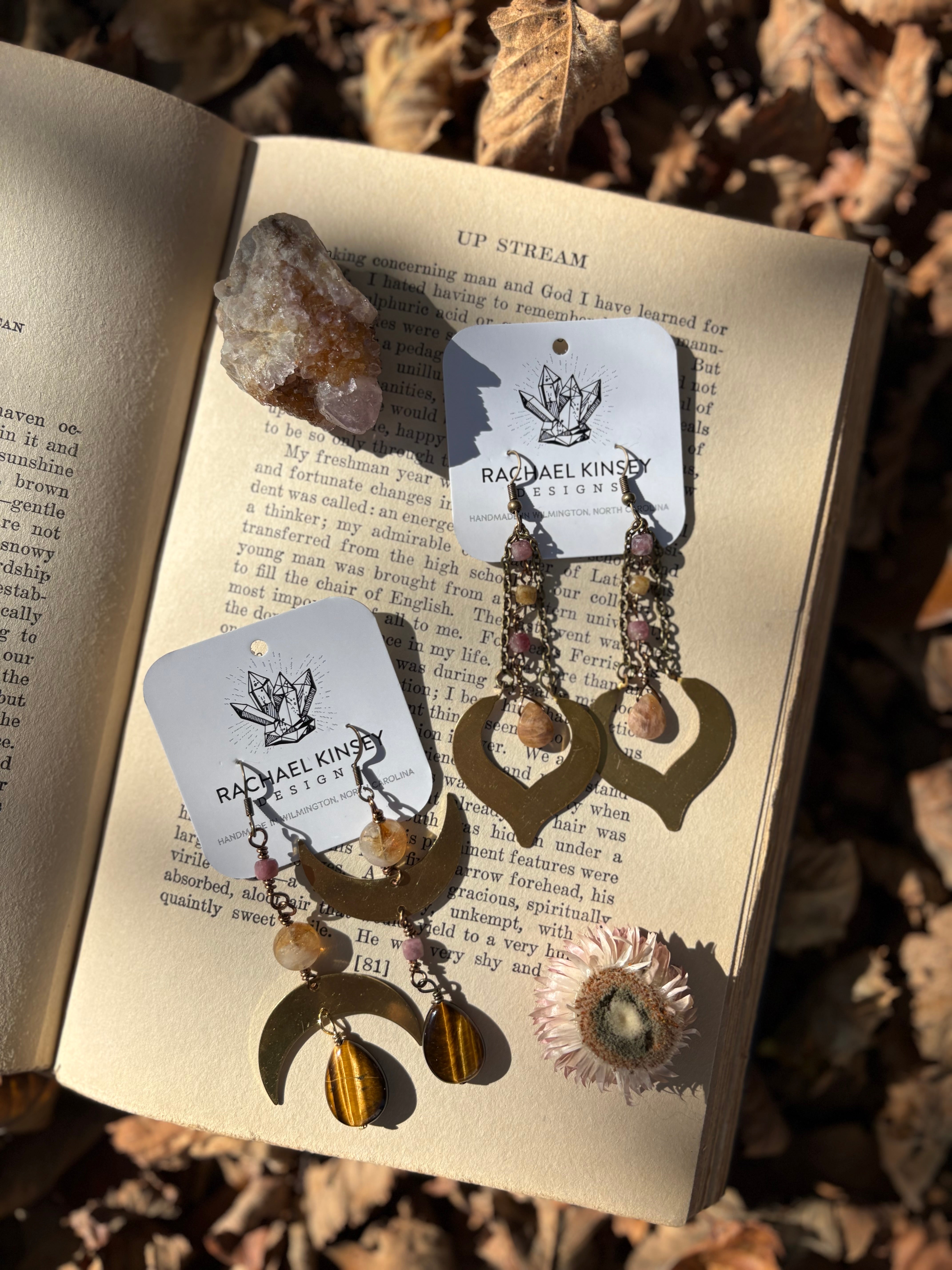 Asymmetrical brass moons adorned with Citrine, Pink Tourmaline, and a second golden Citrine—each stone catching the light in its own way.