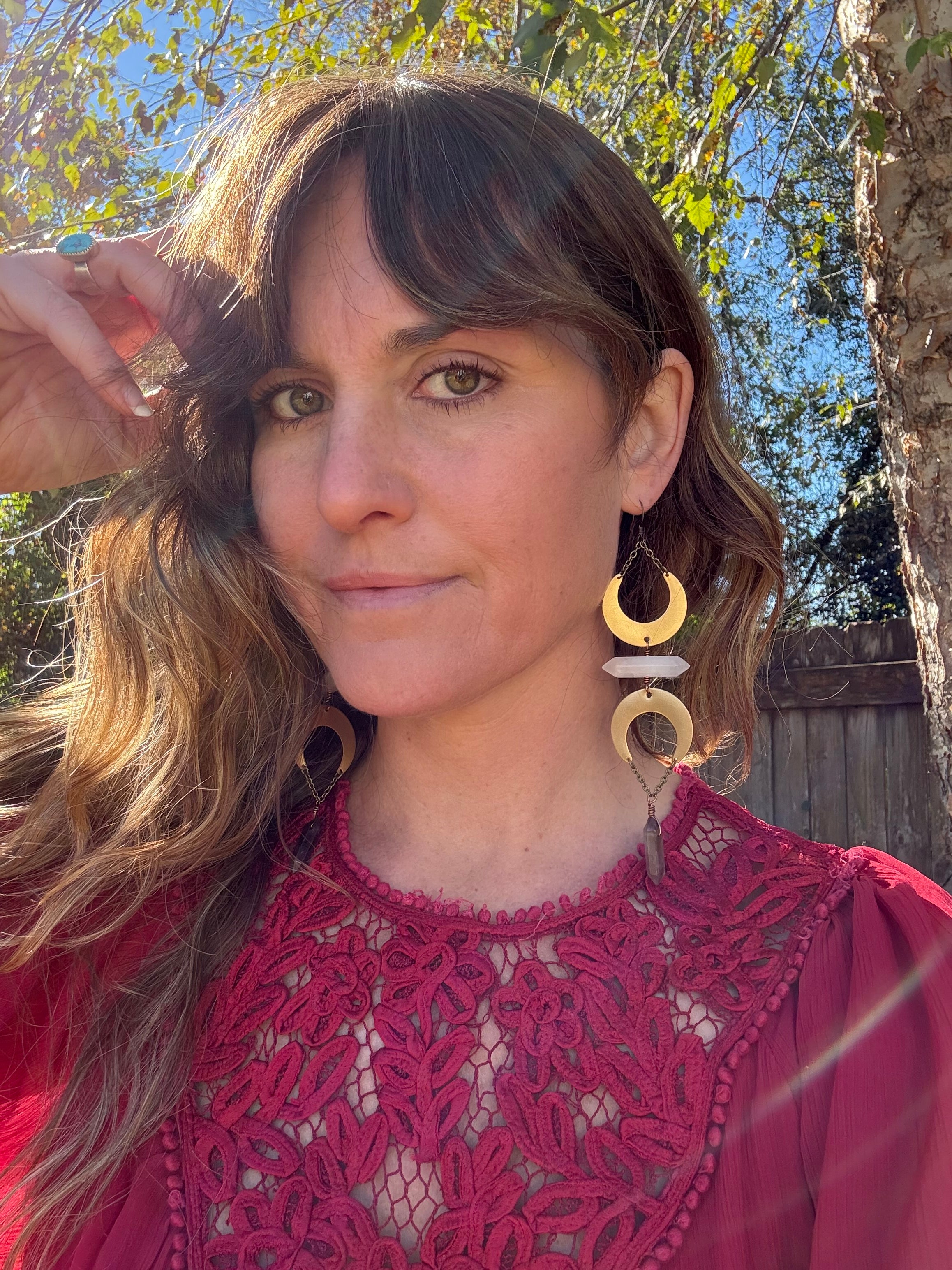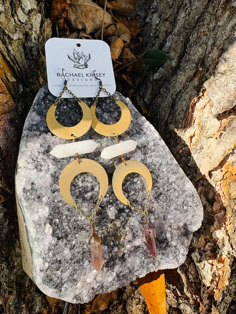 Mirror of the Moons — long, statement earrings featuring brass crescent moons that reflect one another, framing double-terminated quartz and faceted amethyst drops.