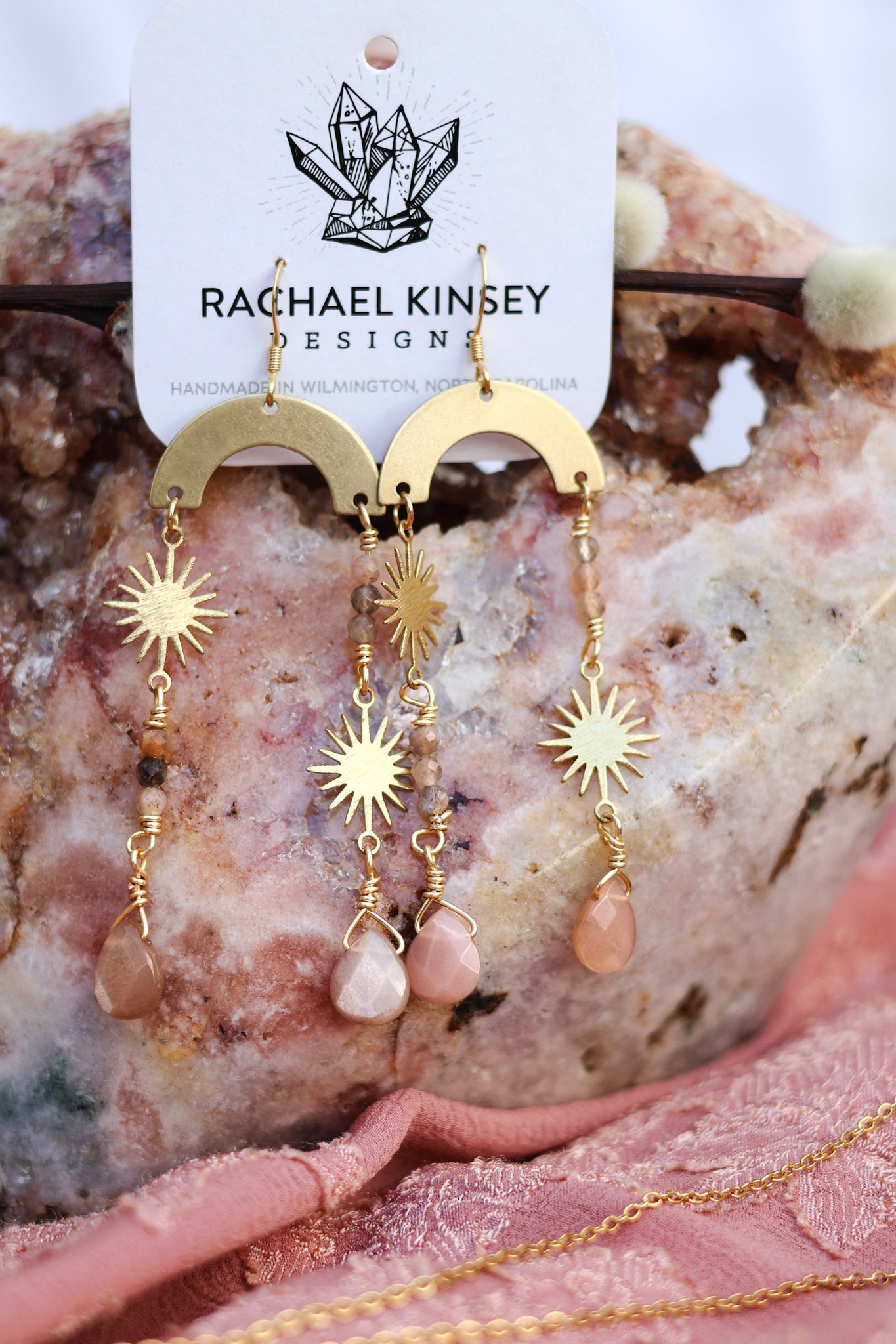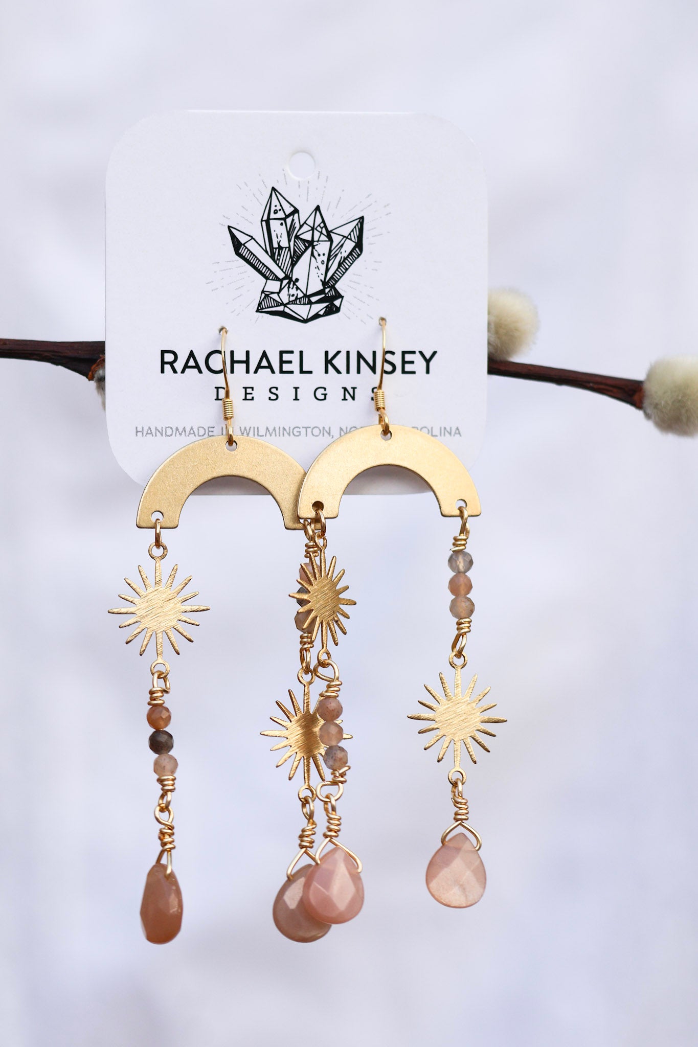 Faceted peach moonstone teardrops and round shimmering beads cascade beneath brass sunburst arches, showcasing the full spectrum of peach moonstone’s soft, glowing warmth.